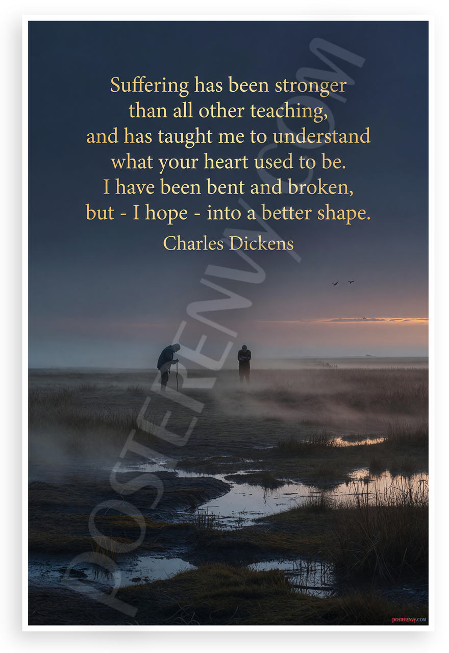 This 12x18 inch poster is printed on premium, durable paper. Proudly Made in the USA by PosterEnvy. The perfect size for any room. PosterEnvy is a family owned business, delivering top-notch posters around the world for over 20 years. Our posters are designed to last — they won't fade or pucker for years of enjoyment. Every poster features crisp, vivid artwork. We are a solar powered company. Featuring Charles Dickens' poignant quote from Great Expectations overlaid in elegant gold type on a melancholic scene of foggy English marshes at dusk with isolated figures in silhouette, evoking reflection and resilience. Ideal for literary enthusiasts and those seeking inspirational wall art.