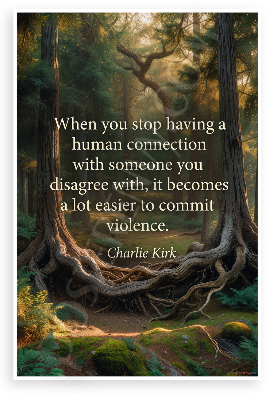 - Reflective Forest Design: Serene intertwined trees and glowing roots frame Charlie Kirk's quote on empathy and violence prevention, creating a peaceful contemplative mood perfect for office, den or study walls