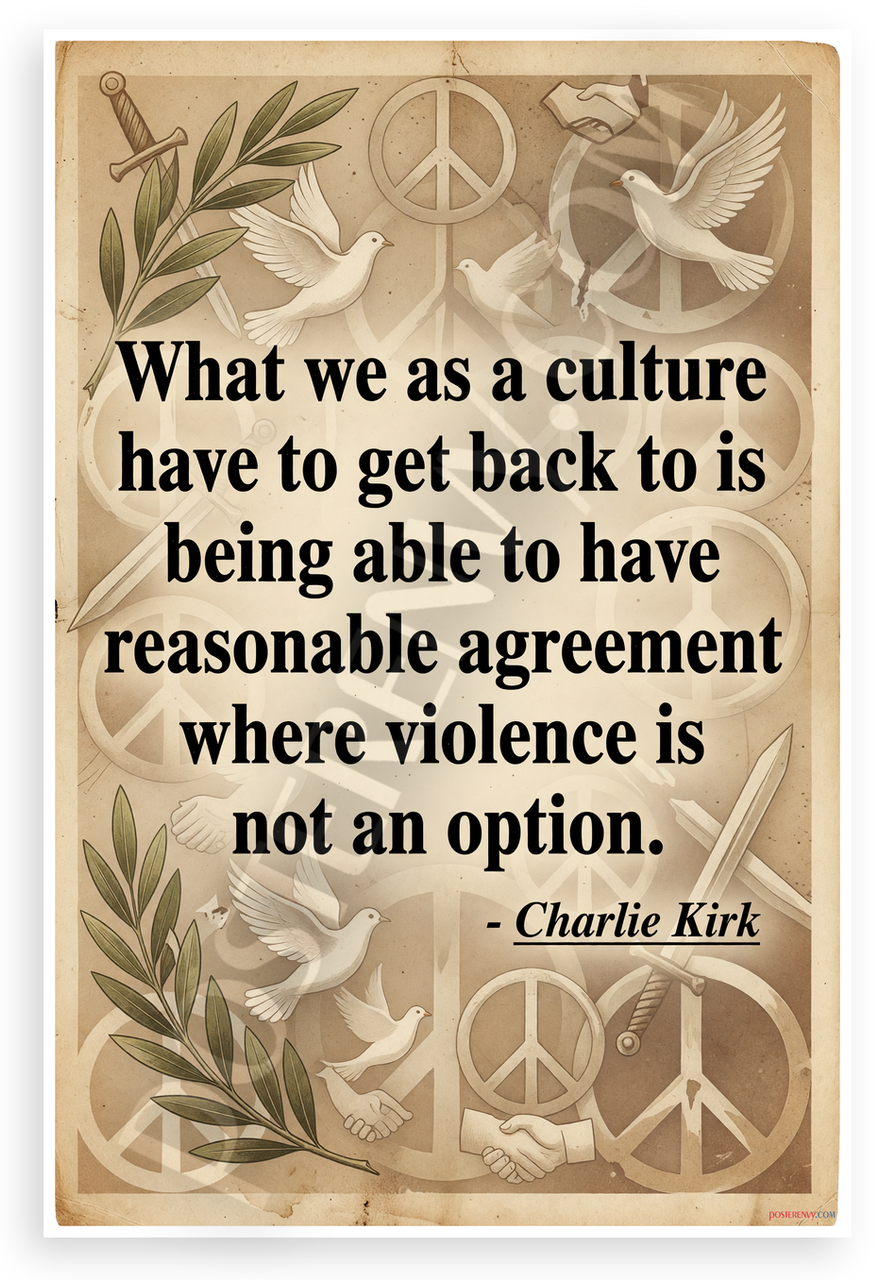 - Inspirational Peace Design: Charlie Kirk quote promotes reasonable discourse without violence, surrounded by symbolic doves, peace signs, olive branches, and handshake on aged parchment background. Ideal for office, den, or study to inspire calm dialogue