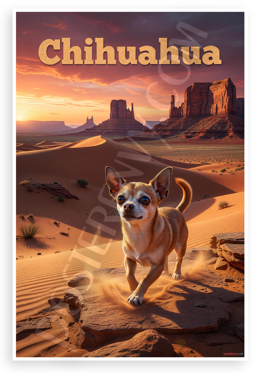 This 12x18 inch poster is printed on premium, durable paper. Proudly Made in the USA by PosterEnvy. The perfect size for any room. PosterEnvy is a family owned business, delivering top-notch posters around the world for over 20 years. Our posters are designed to last — they won't fade or pucker for years of enjoyment. Every poster features crisp, vivid artwork. We are a solar powered company. This dynamic poster captures a curious Chihuahua running through Monument Valley dunes at sunset, with bold 'Chihuahua' text, evoking excitement and exploration in warm orange tones.
