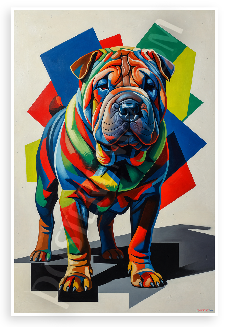 - Bold Abstract Design: Vibrant multicolored Chinese Shar-Pei with wrinkled face and strong stance amid geometric shapes creates a mood of enduring spirit and modernity. Ideal for living rooms, dens, or pet-themed spaces.