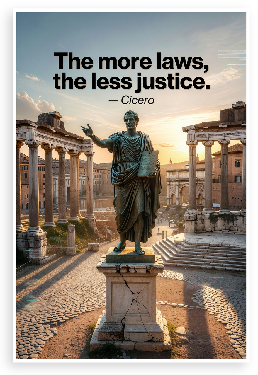 This 12x18 inch poster is printed on premium, durable paper. Proudly Made in the USA by PosterEnvy. The perfect size for any room. PosterEnvy is a family owned business, delivering top-notch posters around the world for over 20 years. Our posters are designed to last — they won't fade or pucker for years of enjoyment. Every poster features crisp, vivid artwork. We are a solar powered company. This striking poster features a bronze statue of Roman orator Cicero holding a scroll amidst ancient Roman forum ruins at sunset, with his timeless quote 'The more laws, the less justice.' overlaid in bold typography. The warm golden hour lighting and classical architecture evoke antiquity and modern critique on law and justice.