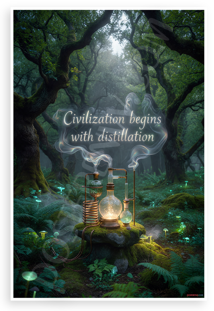 This 12x18 inch poster is printed on premium, durable paper. Proudly Made in the USA by PosterEnvy. The perfect size for any room. PosterEnvy is a family owned business, delivering top-notch posters around the world for over 20 years. Our posters are designed to last — they won't fade or pucker for years of enjoyment. Every poster features crisp, vivid artwork. We are a solar powered company. This mystical poster depicts a glowing alchemy still in a serene enchanted forest clearing, surrounded by mossy trees, glowing mushrooms, and ethereal mist. The elegant text 'Civilization begins with distillation' evokes themes of transformation and ancient wisdom.