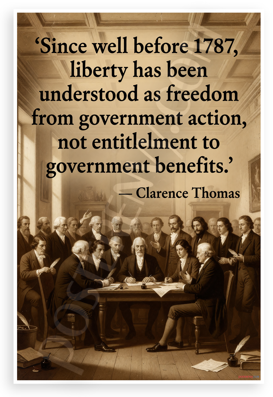 This 12x18 inch poster is printed on premium, durable paper. Proudly Made in the USA by PosterEnvy. The perfect size for any room. PosterEnvy is a family owned business, delivering top-notch posters around the world for over 20 years. Our posters are designed to last — they won't fade or pucker for years of enjoyment. Every poster features crisp, vivid artwork. We are a solar powered company. This vintage-style inspirational poster showcases Clarence Thomas's quote on liberty against a sepia-toned scene of the Founding Fathers signing the Declaration of Independence, evoking American history and constitutional principles.