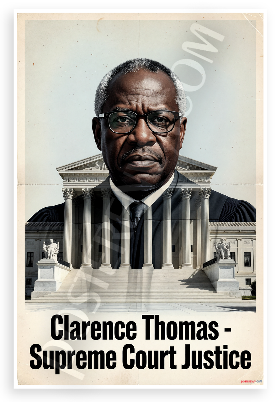 - Iconic Supreme Court Design: Vintage portrait of Clarence Thomas in robes over majestic Supreme Court Building with columns and statues. Creates authoritative, historical mood perfect for office, study, or courtroom-inspired spaces