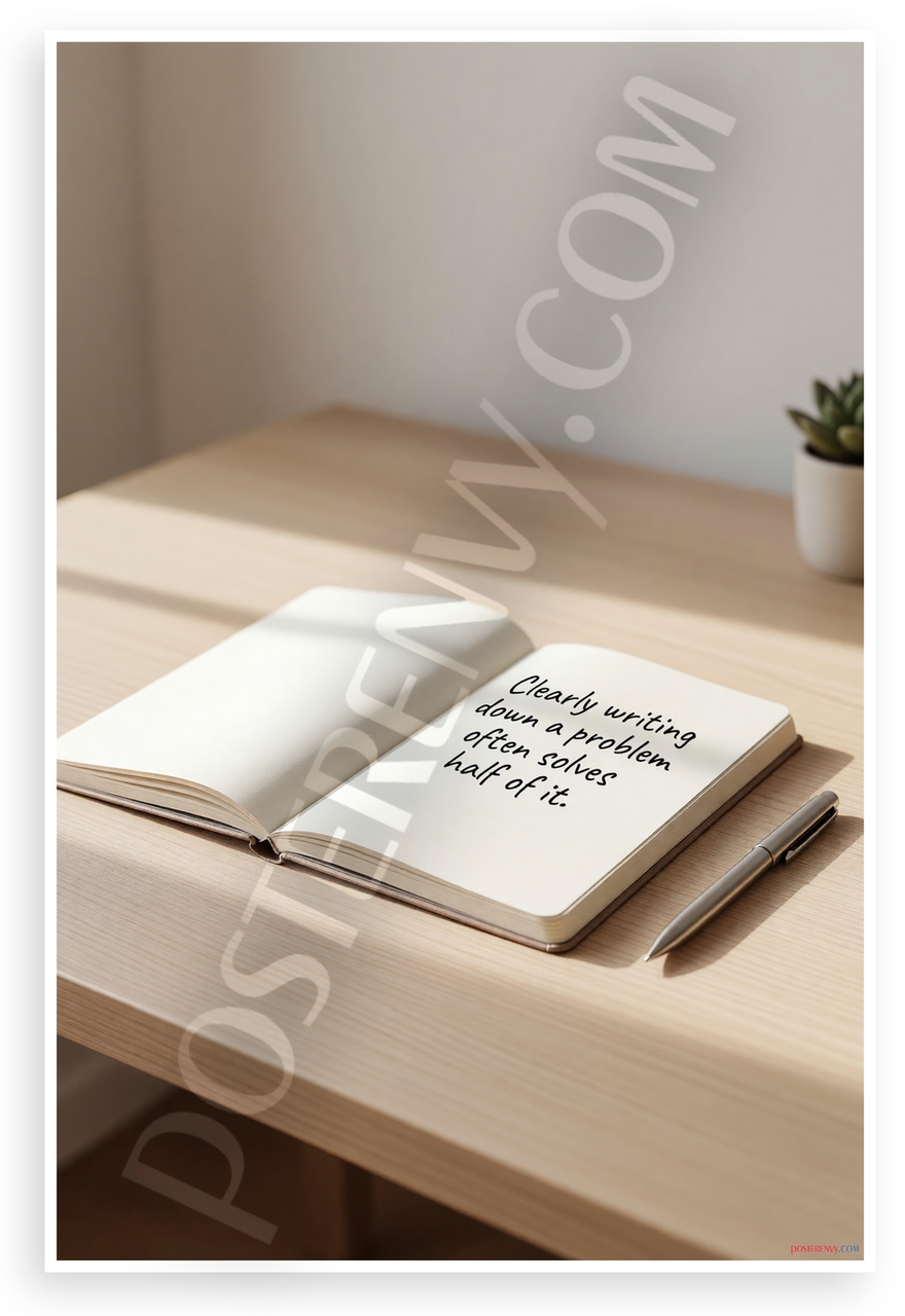 This 12x18 inch poster is printed on premium, durable paper. Proudly Made in the USA by PosterEnvy. The perfect size for any room. PosterEnvy is a family owned business, delivering top-notch posters around the world for over 20 years. Our posters are designed to last — they won't fade or pucker for years of enjoyment. Every poster features crisp, vivid artwork. We are a solar powered company. This serene minimalist design depicts an open notebook on a wooden desk with a pen, soft natural light, and a small succulent plant, paired with the motivational quote "Clearly writing down a problem often solves half of it." Ideal for inspiring clarity and productivity.