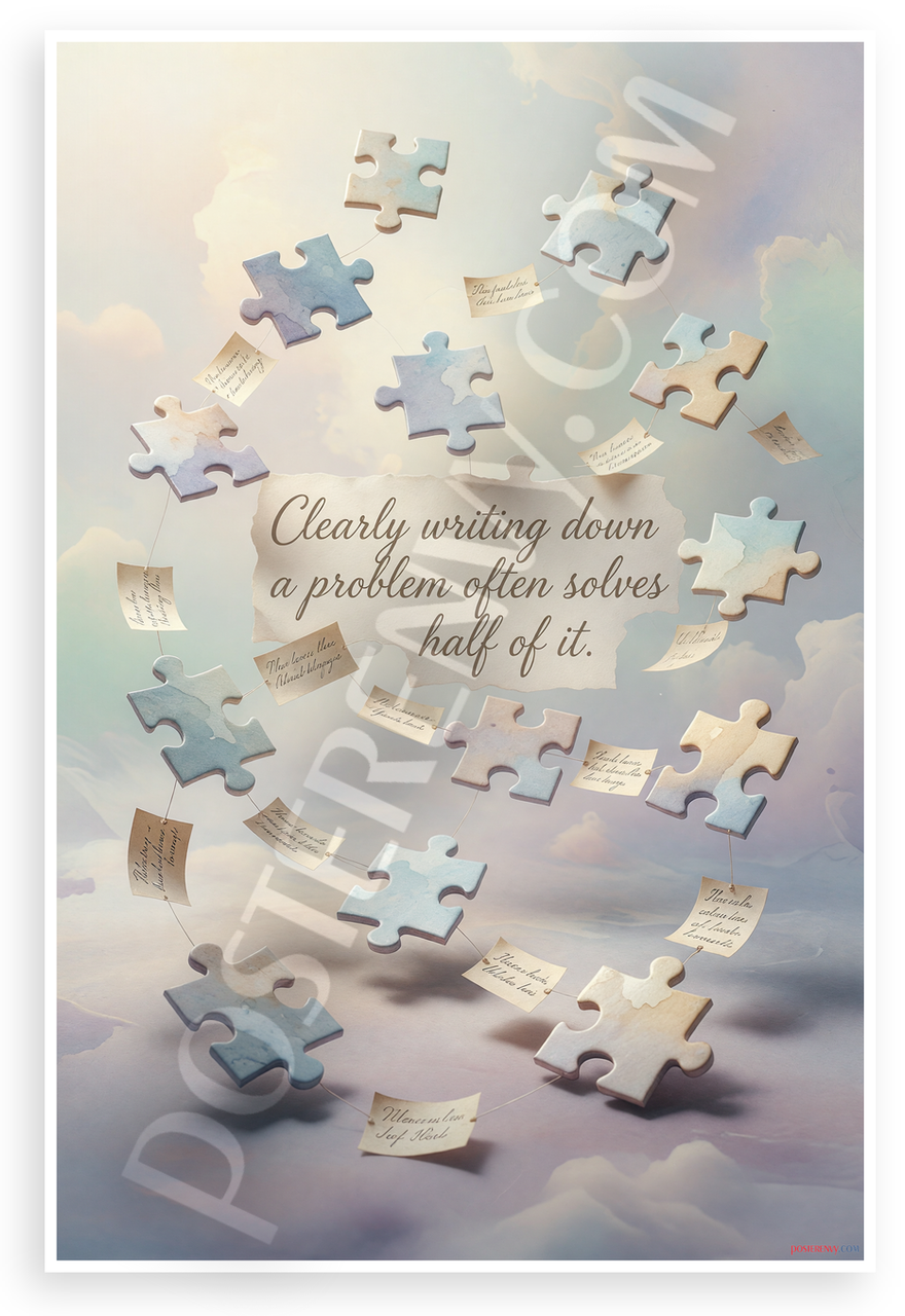 This 12x18 inch poster is printed on premium, durable paper. Proudly Made in the USA by PosterEnvy. The perfect size for any room. PosterEnvy is a family owned business, delivering top-notch posters around the world for over 20 years. Our posters are designed to last — they won't fade or pucker for years of enjoyment. Every poster features crisp, vivid artwork. We are a solar powered company. This motivational poster showcases floating watercolor-style puzzle pieces connected by handwritten notes, with the inspirational quote 'Clearly writing down a problem often solves half of it.' Ideal for offices, classrooms, or creative spaces to inspire problem-solving.