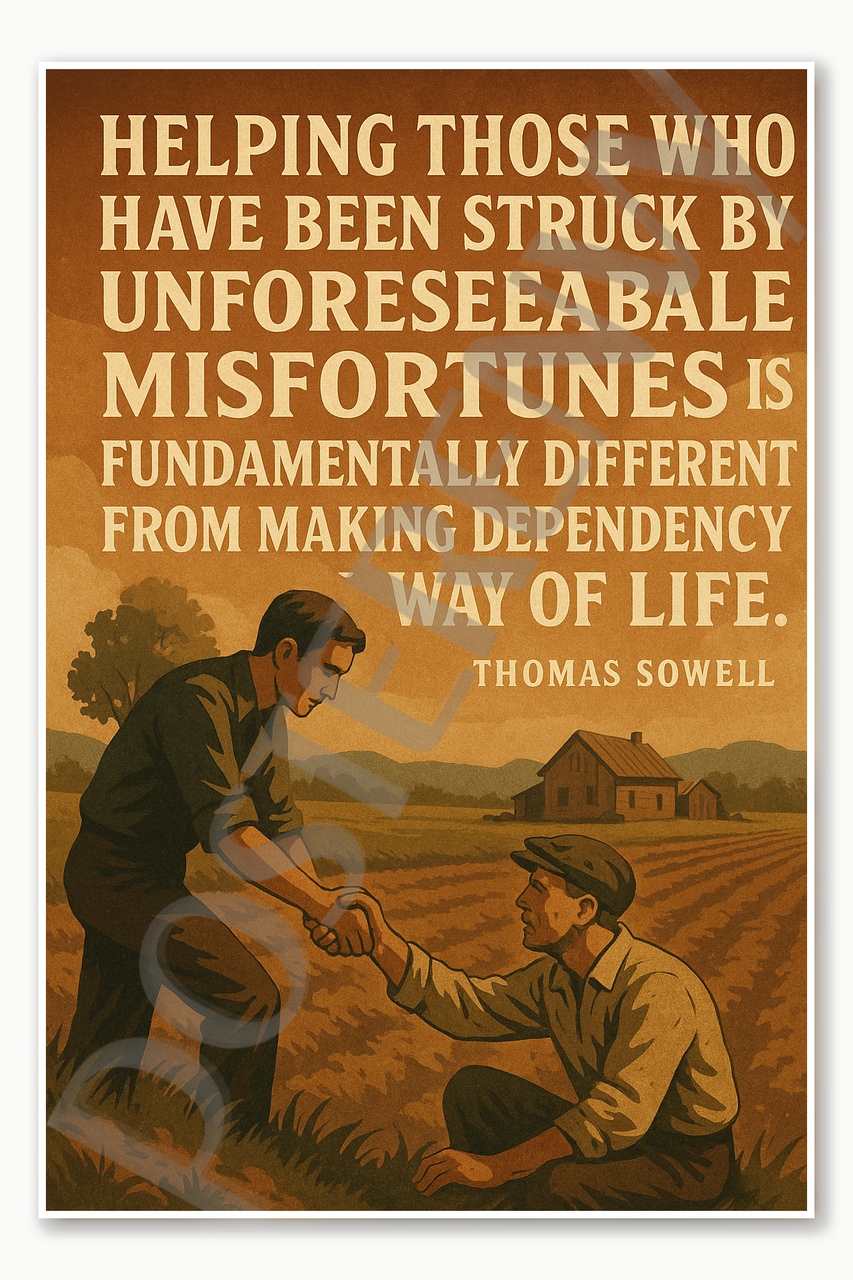 Helping those who have been struck by unforeseeable misfortunes is fundamentally different from making dependency a way of life - Thomas Sowell Poster - 18 inch x 12 inch