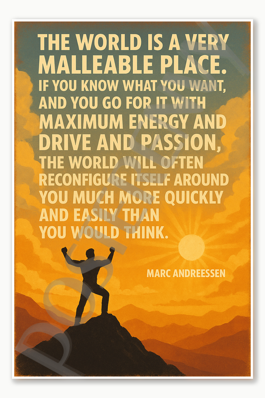 The world is a very malleable place the world will often reconfigure itself around you much more quickly and easily than you would think Marc Andreesen Poster - 18 inch x 12 inch