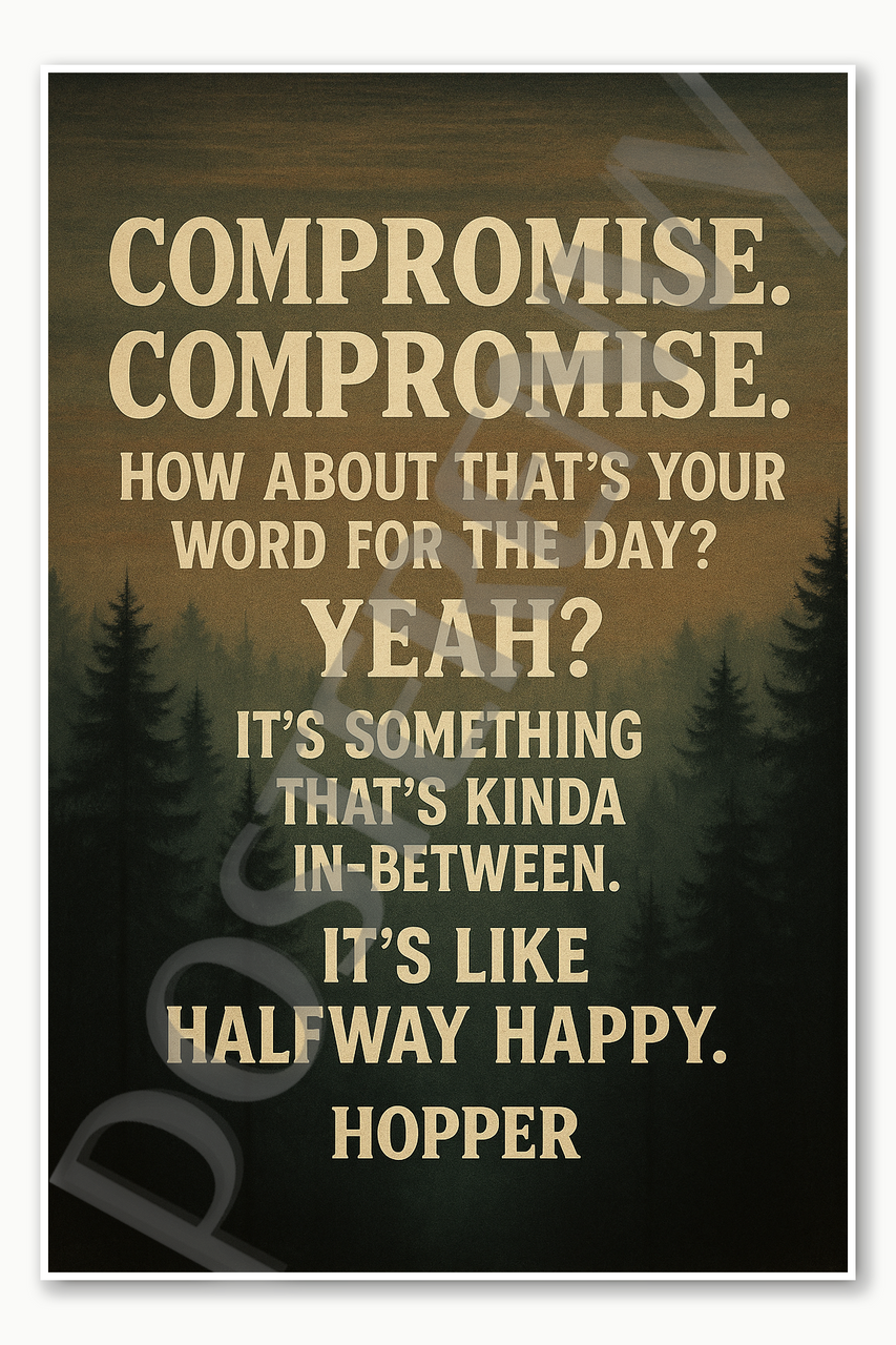 Compromise How about that's your word for the day It's something that's kinda in-between It's like halfway happy - Hopper - Stranger Things Poster 18 inch x 12 inch