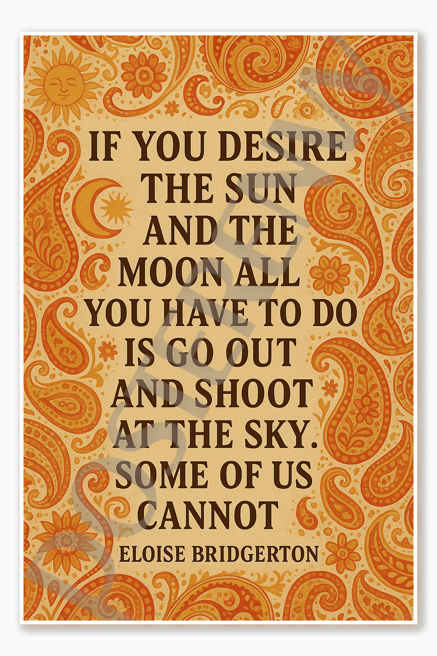 Click the button below to add the If you desire the sun and the moon all you have to do is go out and shoot at sky Some of us cannot — Eloise Bridgerton 1 Poster - 18 inch x 12 inch to your wish list.