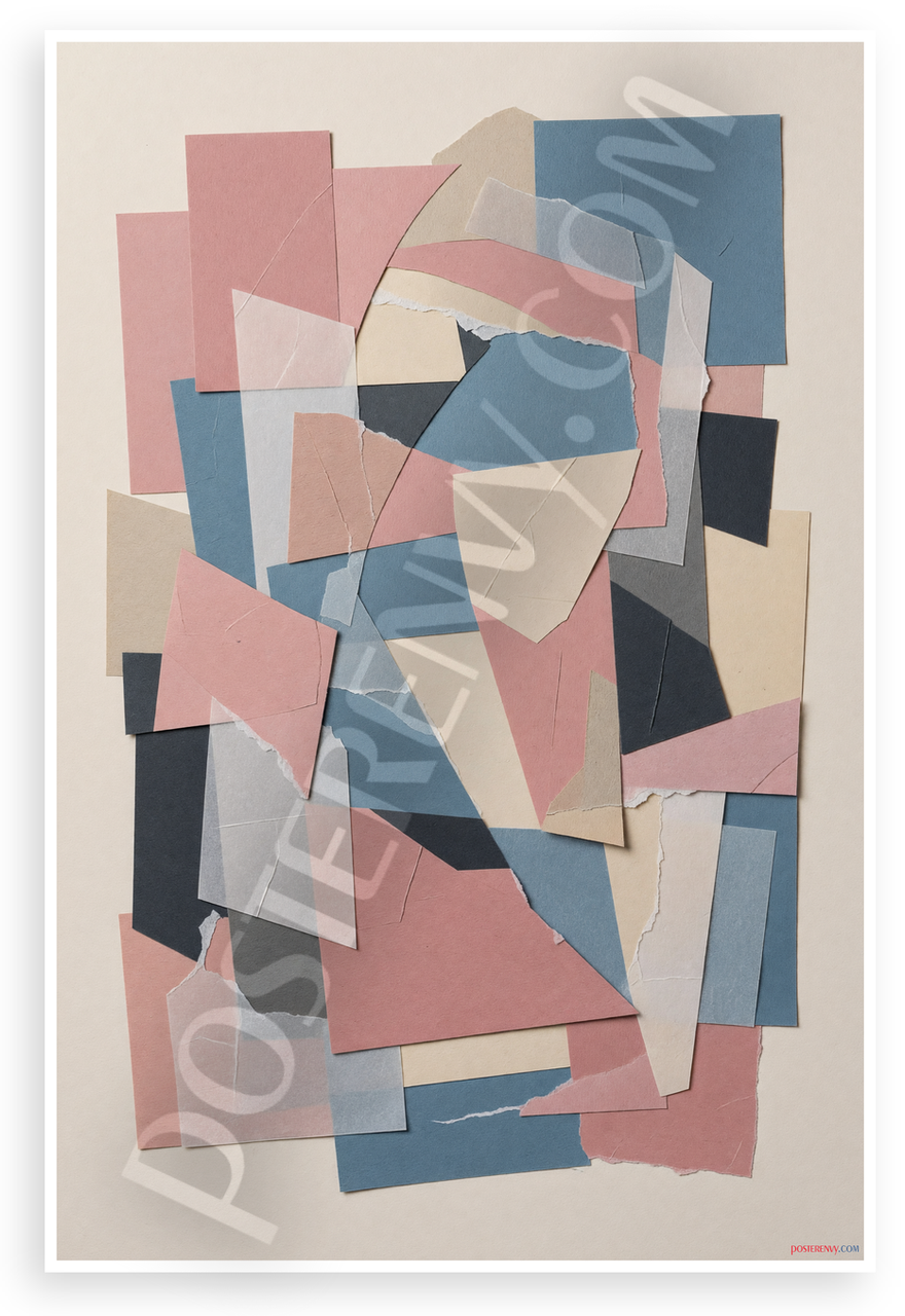 - Textured Collage Design: Dynamic abstract composition of overlapping torn paper pieces in soft pinks, beiges, blues, grays and blacks evokes serene modern mood, ideal for living rooms, offices or creative studios