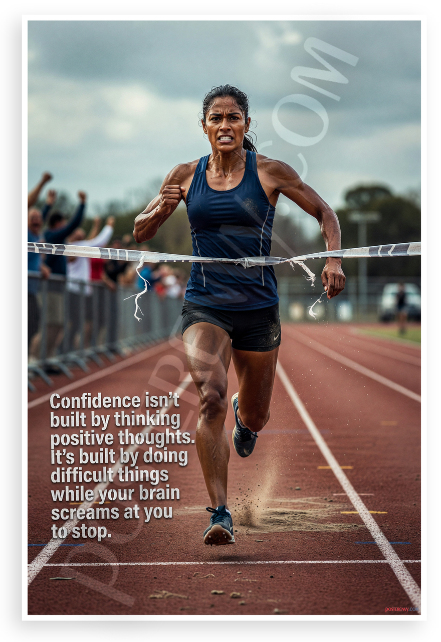 This 12x18 inch poster is printed on premium, durable paper. Proudly Made in the USA by PosterEnvy. The perfect size for any room. PosterEnvy is a family owned business, delivering top-notch posters around the world for over 20 years. Our posters are designed to last — they won't fade or pucker for years of enjoyment. Every poster features crisp, vivid artwork. We are a solar powered company. This dynamic motivational poster depicts a triumphant Latina female runner breaking through the finish line tape on a red track, with a gritty crowd cheering in the background under a cloudy sky. The bold quote 'Confidence isn’t built by thinking positive thoughts. It’s built by doing difficult things while your brain screams at you to stop.' overlays the intense scene, inspiring determination and perseverance.