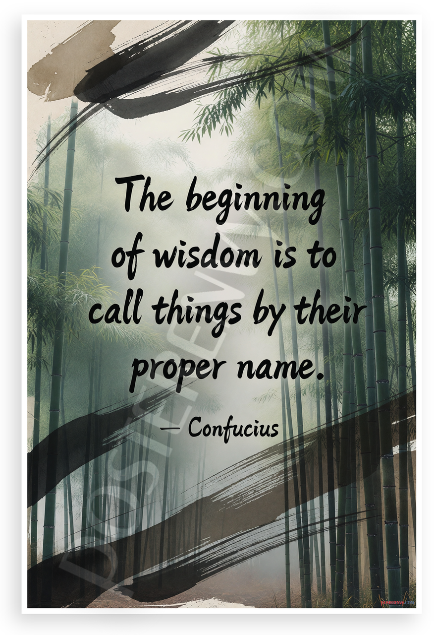 This 12x18 inch poster is printed on premium, durable paper. Proudly Made in the USA by PosterEnvy. The perfect size for any room. PosterEnvy is a family owned business, delivering top-notch posters around the world for over 20 years. Our posters are designed to last — they won't fade or pucker for years of enjoyment. Every poster features crisp, vivid artwork. We are a solar powered company. Featuring the timeless Confucius quote 'The beginning of wisdom is to call things by their proper name' elegantly scripted over a serene bamboo forest with ink brush strokes, evoking ancient Eastern philosophy and tranquility.