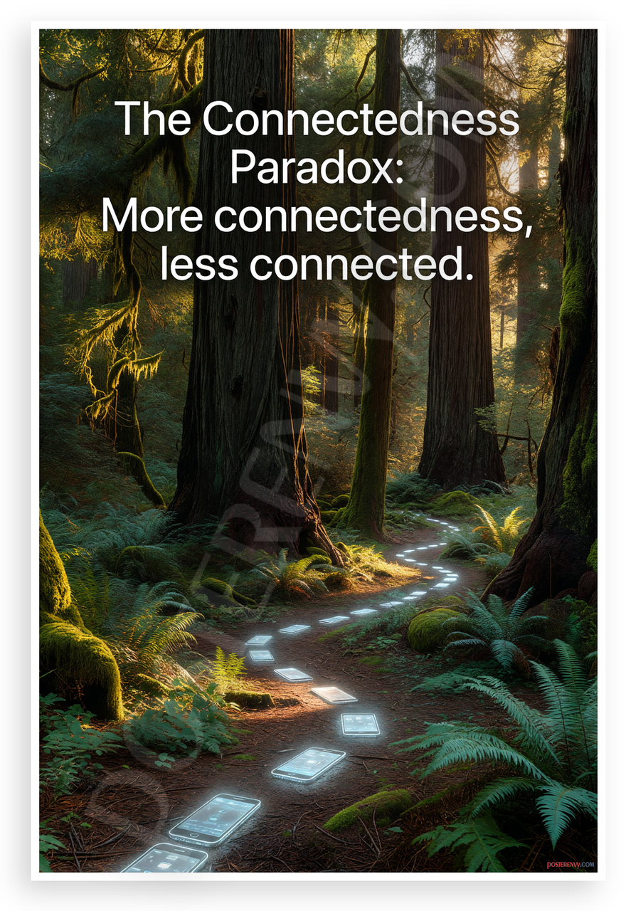 This 12x18 inch poster is printed on premium, durable paper. Proudly Made in the USA by PosterEnvy. The perfect size for any room. PosterEnvy is a family owned business, delivering top-notch posters around the world for over 20 years. Our posters are designed to last — they won't fade or pucker for years of enjoyment. Every poster features crisp, vivid artwork. We are a solar powered company. This striking design features a serene forest path made of glowing smartphone screens, overlaid with the thought-provoking quote 'The Connectedness Paradox: More connectedness, less connected.' It blends natural tranquility with modern technology themes for a reflective mood.