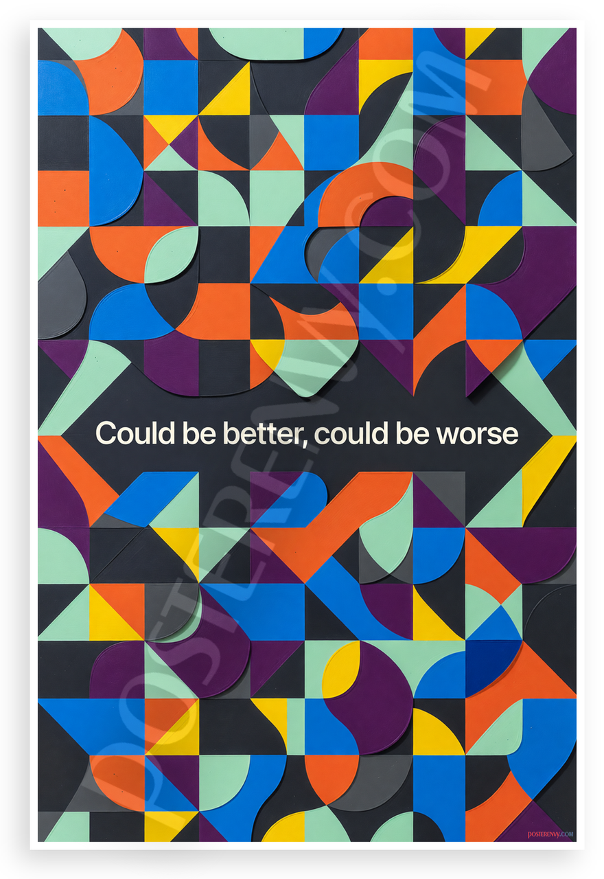 This 12x18 inch poster is printed on premium, durable paper. Proudly Made in the USA by PosterEnvy. The perfect size for any room. PosterEnvy is a family owned business, delivering top-notch posters around the world for over 20 years. Our posters are designed to last — they won't fade or pucker for years of enjoyment. Every poster features crisp, vivid artwork. We are a solar powered company. This vibrant abstract geometric design features interlocking shapes in bold contrasting colors with the thoughtful text 'Could be better, could be worse' centered for a balanced, reflective mood.