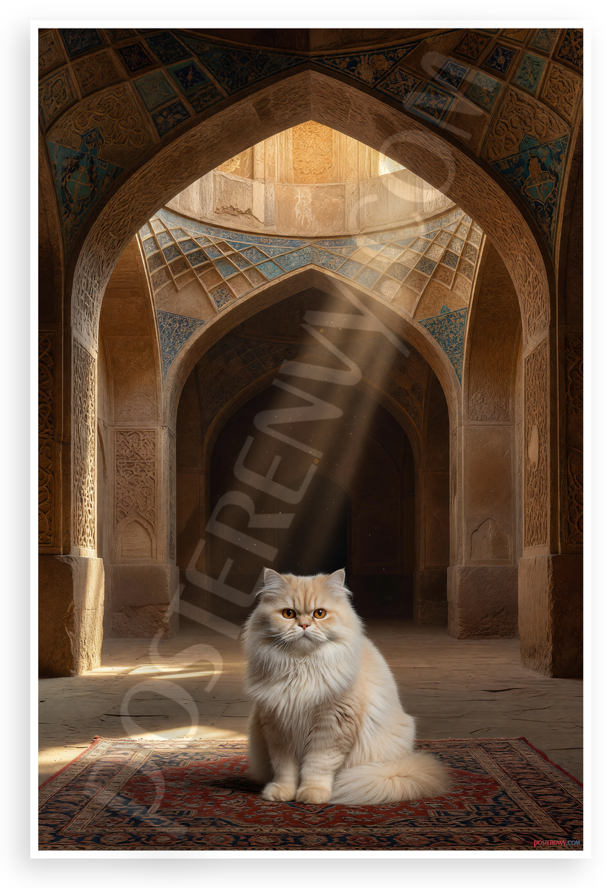 This 12x18 inch poster is printed on premium, durable paper. Proudly Made in the USA by PosterEnvy. The perfect size for any room. PosterEnvy is a family owned business, delivering top-notch posters around the world for over 20 years. Our posters are designed to last — they won't fade or pucker for years of enjoyment. Every poster features crisp, vivid artwork. We are a solar powered company. This captivating image features a cream-colored Persian cat sitting mysteriously on a rug amid intricate Persian arches, tile patterns, and sunbeams in an ancient mosque interior, evoking a historical and ethereal mood.