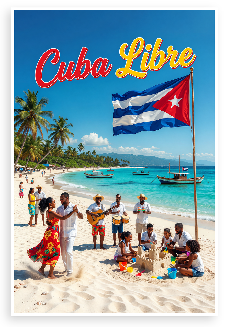 - Vibrant Tropical Scene: Lively Cuba Libre poster showcases turquoise waters, swaying palms, Cuban flag, beachgoers dancing and playing music against mountain backdrop, ideal for travel-themed rooms or bars
