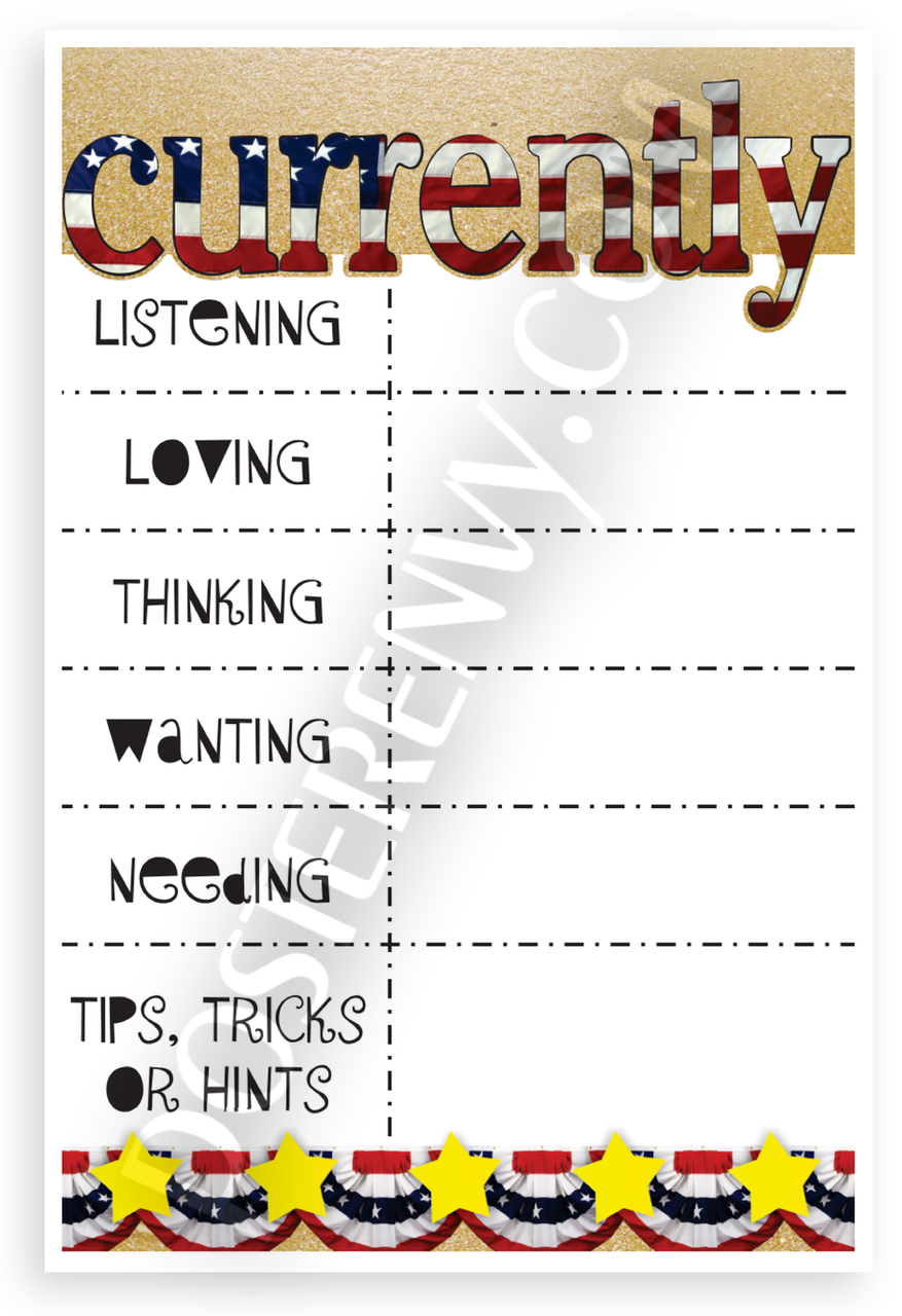 This 12x18 inch poster is printed on premium, durable paper. Proudly Made in the USA by PosterEnvy. The perfect size for any room. PosterEnvy is a family owned business, delivering top-notch posters around the world for over 20 years. Our posters are designed to last — they won't fade or pucker for years of enjoyment. Every poster features crisp, vivid artwork. We are a solar powered company. This motivational classroom poster features a patriotic red white blue design with a fill-in chart for Currently Listening, Loving, Thinking, Wanting, Needing, and Tips Tricks or Hints. Ideal for student engagement and organization.