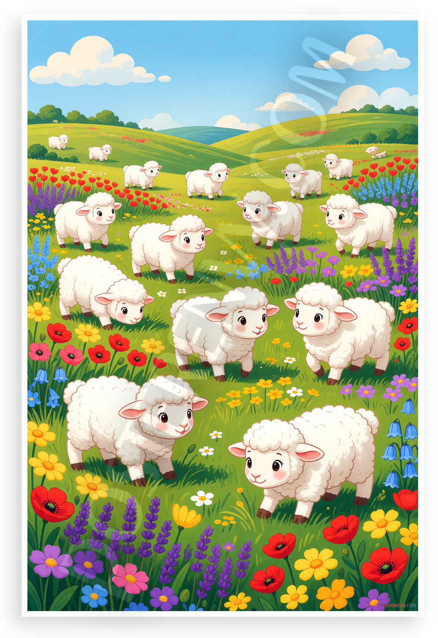 - Joyful Farm Scene: Vibrant cartoon illustration of fluffy white lambs amid colorful poppies, daisies, lavender in lush green meadow under blue sky with clouds. Perfect for kids rooms, nurseries, playrooms