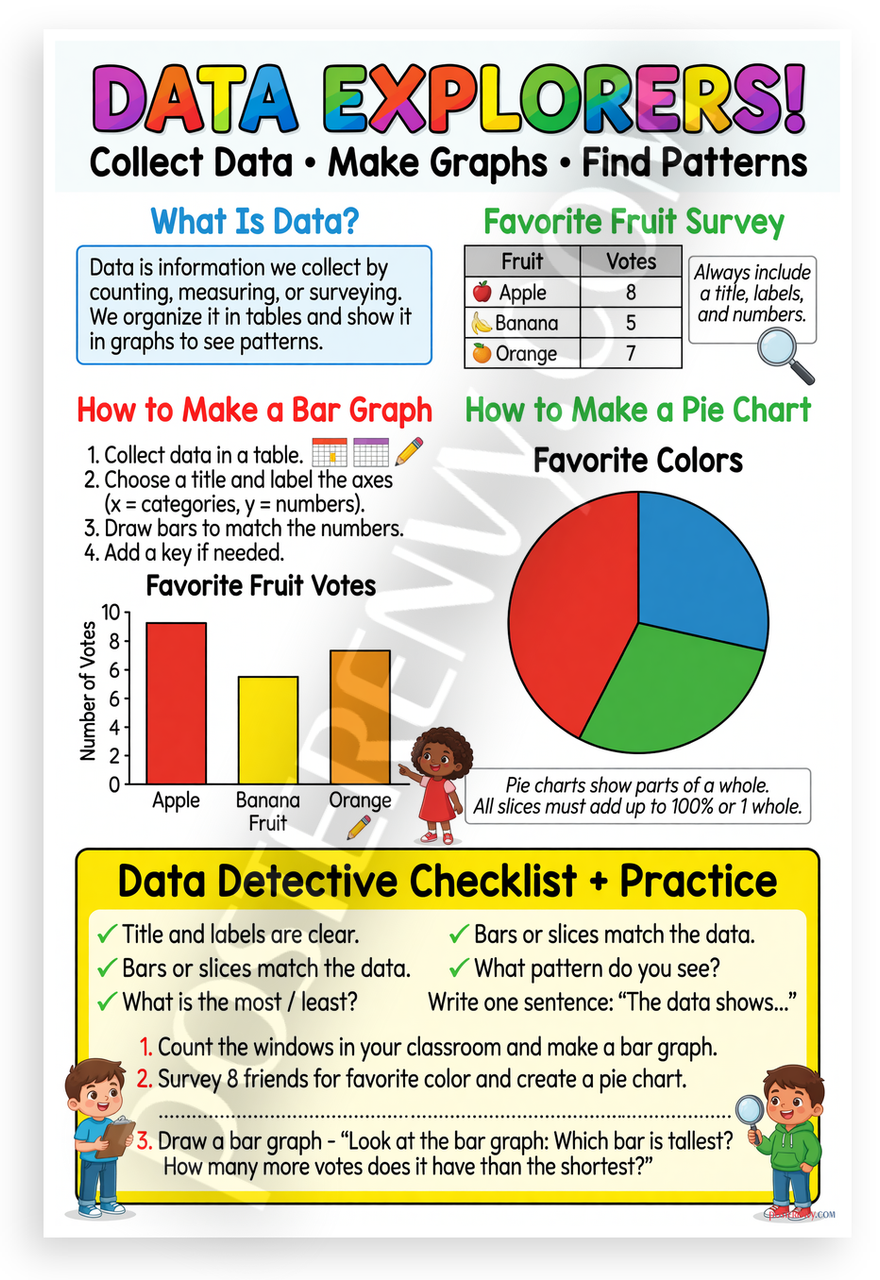 - Engaging Math Lesson: Bright cartoon-style poster with bar graphs pie charts tables and checklists teaches data collection graphing and pattern analysis ideal for 2nd grade classrooms homeschool study areas