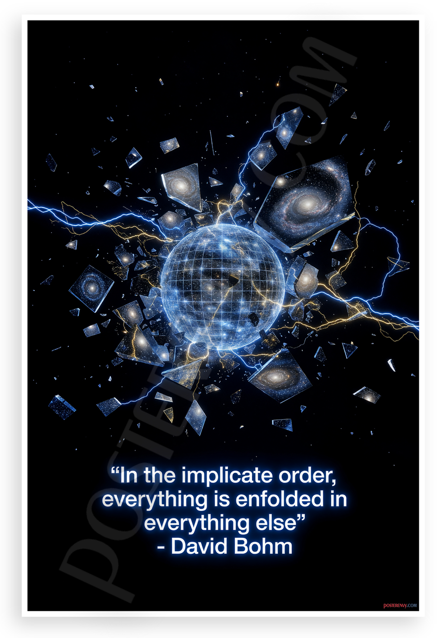 This 12x18 inch poster is printed on premium, durable paper. Proudly Made in the USA by PosterEnvy. The perfect size for any room. PosterEnvy is a family owned business, delivering top-notch posters around the world for over 20 years. Our posters are designed to last — they won't fade or pucker for years of enjoyment. Every poster features crisp, vivid artwork. We are a solar powered company. This surreal quantum physics poster showcases a shattering holographic sphere with galaxies and electric blue-gold energy on a black space background, overlaid with David Bohm's profound quote on the implicate order. Ideal for inspiring contemplation in science or philosophy spaces.