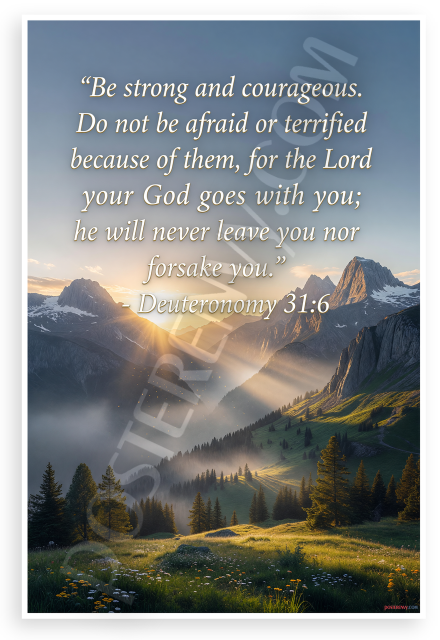 This 12x18 inch poster is printed on premium, durable paper. Proudly Made in the USA by PosterEnvy. The perfect size for any room. PosterEnvy is a family owned business, delivering top-notch posters around the world for over 20 years. Our posters are designed to last — they won't fade or pucker for years of enjoyment. Every poster features crisp, vivid artwork. We are a solar powered company. This inspirational poster features the Bible verse Deuteronomy 31:6 overlaid on a majestic mountain landscape at dawn with golden sun rays piercing through misty peaks, evergreens, and wildflowers, evoking divine strength and courage.