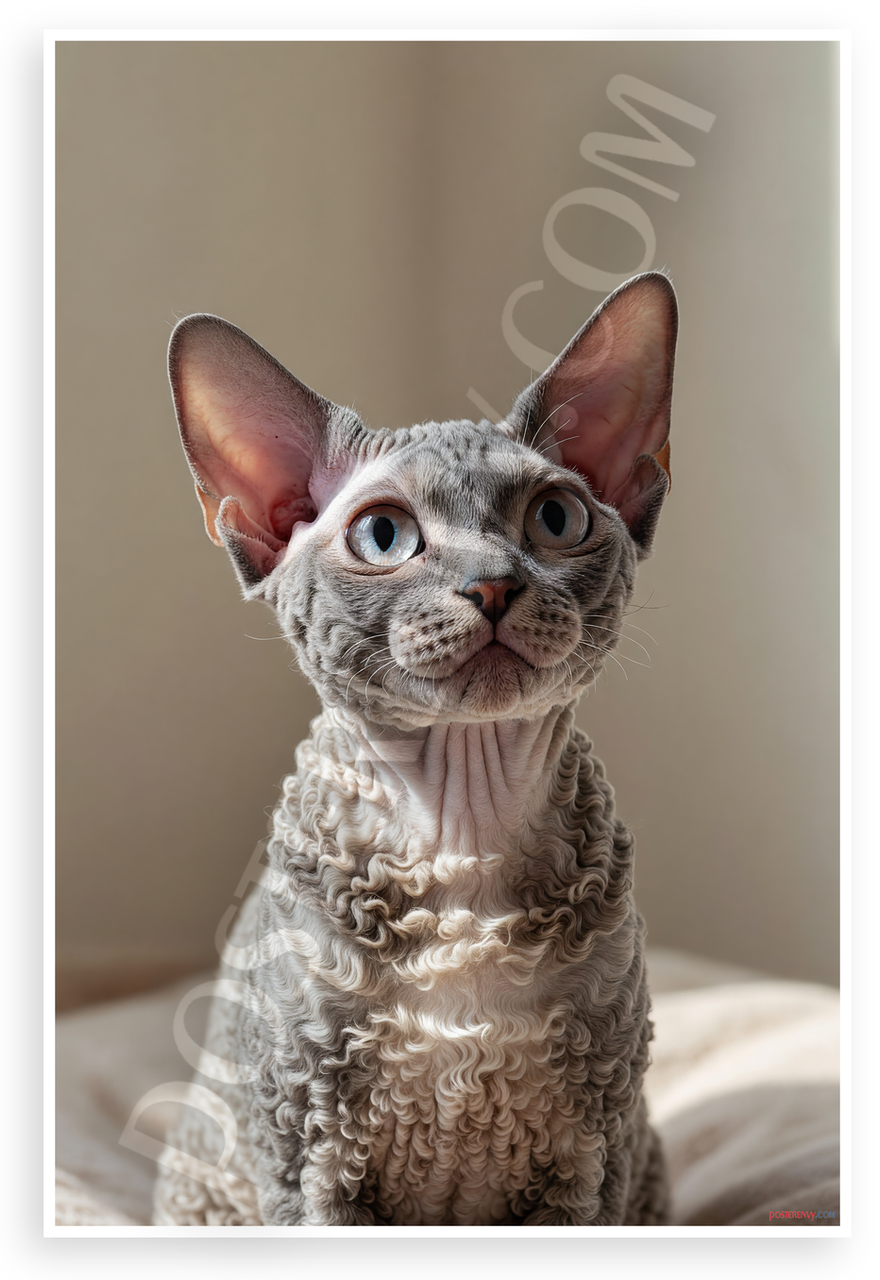 - Elegant Cat Portrait: Realistic close-up of Devon Rex with large ears, curly fur, wide blue eyes, and graceful curious look against soft beige background. Ideal for living room, bedroom, or home office