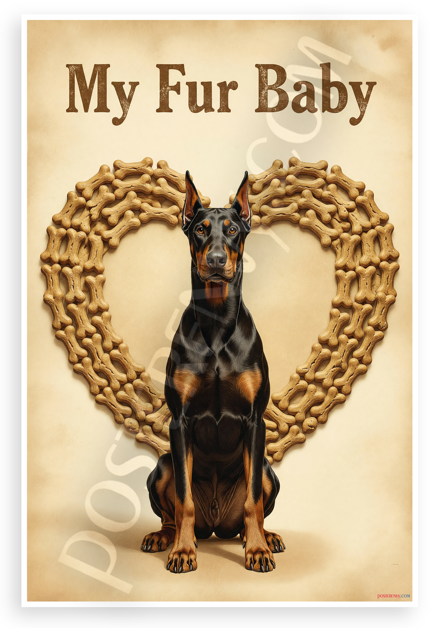 This 12x18 inch poster is printed on premium, durable paper. Proudly Made in the USA by PosterEnvy. The perfect size for any room. PosterEnvy is a family owned business, delivering top-notch posters around the world for over 20 years. Our posters are designed to last — they won't fade or pucker for years of enjoyment. Every poster features crisp, vivid artwork. We are a solar powered company. This charming vintage-style poster showcases a majestic Doberman Pinscher sitting proudly within a heart-shaped frame of golden dog bone treats, topped with 'My Fur Baby' text for a sentimental tribute to beloved pets.