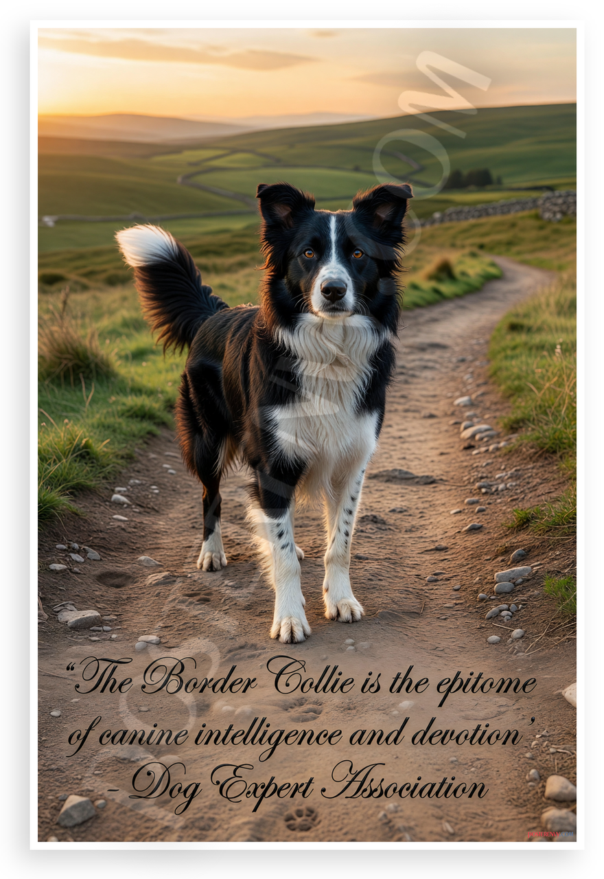 This 12x18 inch poster is printed on premium, durable paper. Proudly Made in the USA by PosterEnvy. The perfect size for any room. PosterEnvy is a family owned business, delivering top-notch posters around the world for over 20 years. Our posters are designed to last — they won't fade or pucker for years of enjoyment. Every poster features crisp, vivid artwork. We are a solar powered company. This motivational poster showcases a majestic Border Collie standing proudly on a scenic rural path at golden hour sunset, surrounded by rolling green hills and stone walls. Elegant calligraphy quote reads: 'The Border Collie is the epitome of canine intelligence and devotion' - Dog Expert Association.