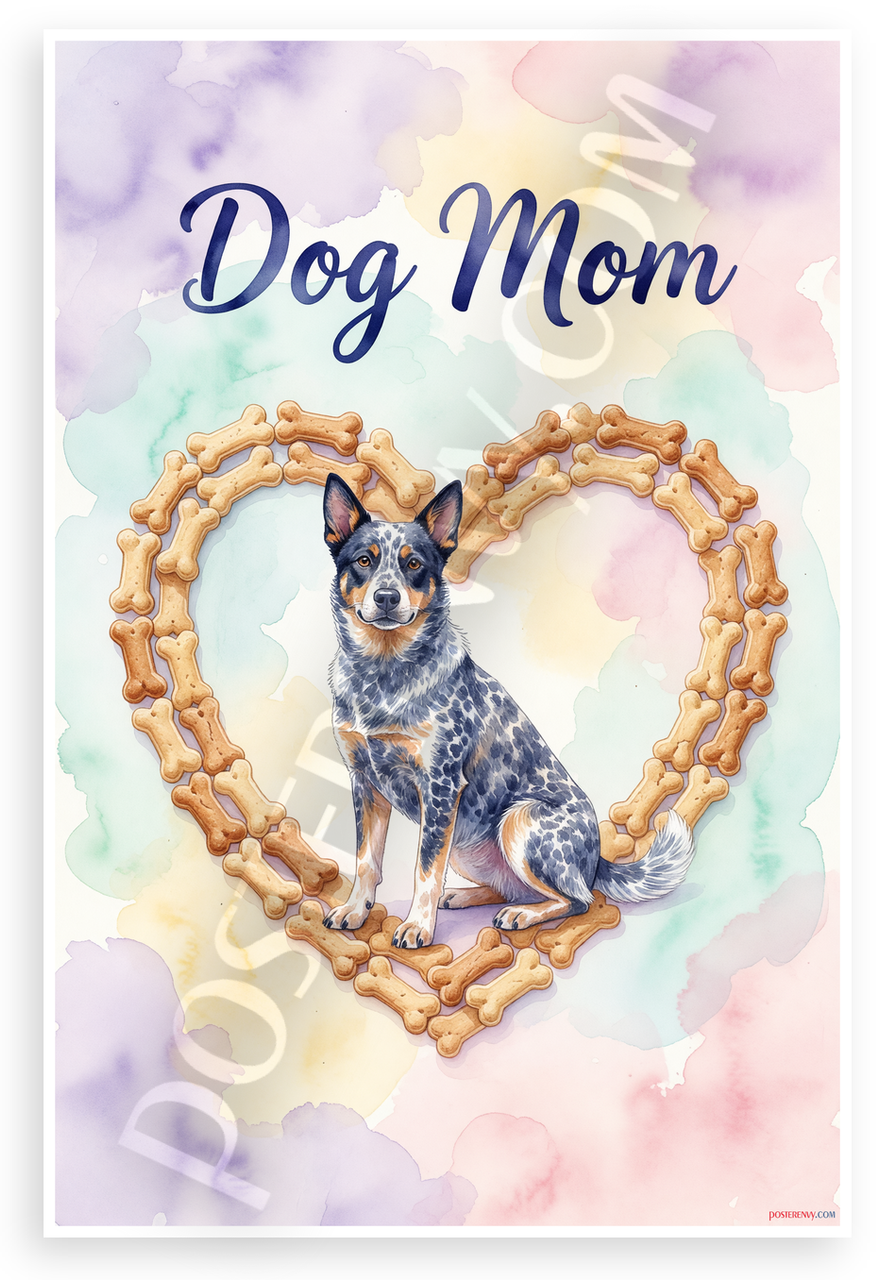 - Premium Print: This PosterEnvy 12x18 inch poster is printed on Durable, Heavy Duty Paper, Designed to last many years. Features Australian Cattle Dog in watercolor style with Dog Mom theme and bone heart frame