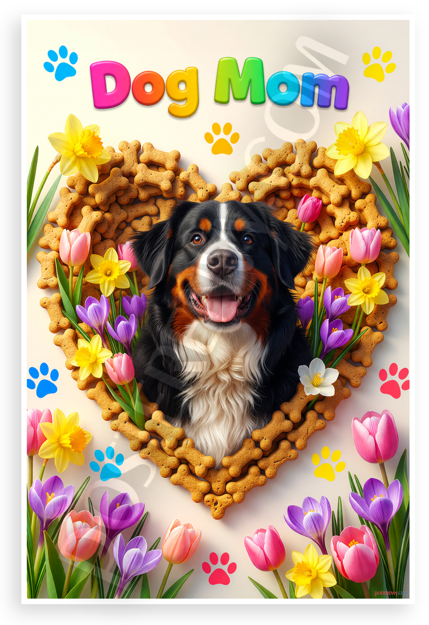 This 12x18 inch poster is printed on premium, durable paper. Proudly Made in the USA by PosterEnvy. The perfect size for any room. PosterEnvy is a family owned business, delivering top-notch posters around the world for over 20 years. Our posters are designed to last — they won't fade or pucker for years of enjoyment. Every poster features crisp, vivid artwork. We are a solar powered company. Celebrate dog lovers with this playful design featuring a joyful Bernese Mountain Dog in a heart of dog bone treats, surrounded by colorful spring flowers like tulips and daffodils, and vibrant Dog Mom text.