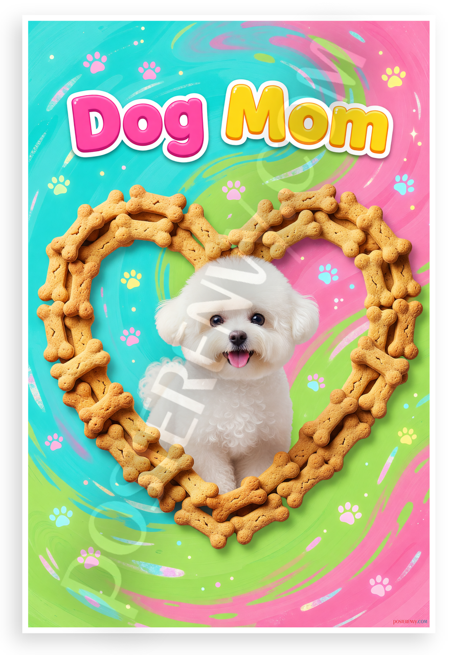 This 12x18 inch poster is printed on premium, durable paper. Proudly Made in the USA by PosterEnvy. The perfect size for any room. PosterEnvy is a family owned business, delivering top-notch posters around the world for over 20 years. Our posters are designed to last — they won't fade or pucker for years of enjoyment. Every poster features crisp, vivid artwork. We are a solar powered company. This vibrant poster showcases a cute Bichon Frise puppy framed in a whimsical heart made of dog bone treats, with bold 'Dog Mom' text and playful paw prints on a colorful swirling background. Ideal for dog lovers' spaces.