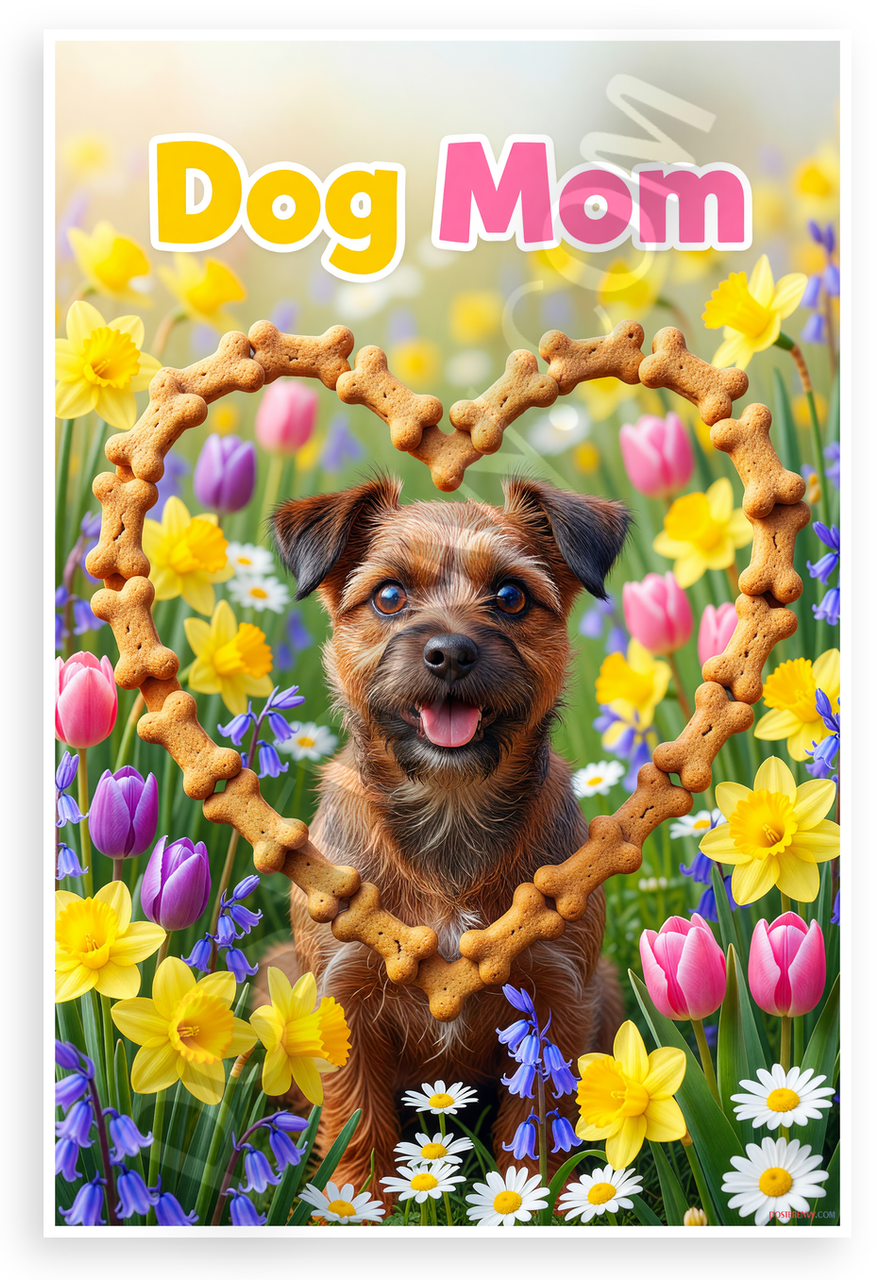 This 12x18 inch poster is printed on premium, durable paper. Proudly Made in the USA by PosterEnvy. The perfect size for any room. PosterEnvy is a family owned business, delivering top-notch posters around the world for over 20 years. Our posters are designed to last — they won't fade or pucker for years of enjoyment. Every poster features crisp, vivid artwork. We are a solar powered company. Celebrate dog lovers with this vibrant design featuring a cute Border Terrier framed in a heart of dog bone treats amid colorful spring flowers like tulips, daffodils, and bluebells. Playful yellow and pink Dog Mom text adds cheerful charm.
