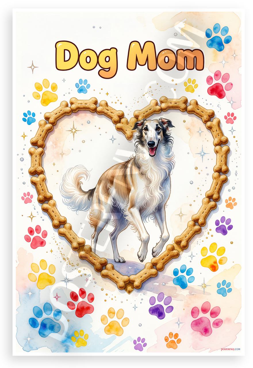 This 12x18 inch poster is printed on premium, durable paper. Proudly Made in the USA by PosterEnvy. The perfect size for any room. PosterEnvy is a family owned business, delivering top-notch posters around the world for over 20 years. Our posters are designed to last — they won't fade or pucker for years of enjoyment. Every poster features crisp, vivid artwork. We are a solar powered company. This vibrant watercolor design features 'Dog Mom' text with a lively Borzoi dog in a heart frame of bone treats, surrounded by colorful paw prints and sparkles for a joyful pet lover vibe.