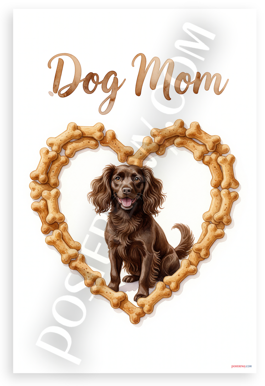 This 12x18 inch poster is printed on premium, durable paper. Proudly Made in the USA by PosterEnvy. The perfect size for any room. PosterEnvy is a family owned business, delivering top-notch posters around the world for over 20 years. Our posters are designed to last — they won't fade or pucker for years of enjoyment. Every poster features crisp, vivid artwork. We are a solar powered company. Celebrate the joy of pet parenthood with this whimsical watercolor design featuring a cute Boykin Spaniel sitting inside a heart frame made of dog bones, topped with playful 'Dog Mom' text in warm brown tones.