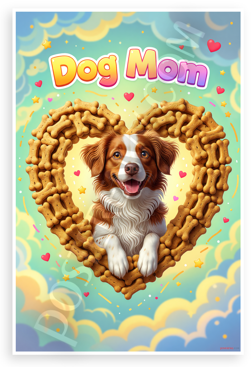 This 12x18 inch poster is printed on premium, durable paper. Proudly Made in the USA by PosterEnvy. The perfect size for any room. PosterEnvy is a family owned business, delivering top-notch posters around the world for over 20 years. Our posters are designed to last — they won't fade or pucker for years of enjoyment. Every poster features crisp, vivid artwork. We are a solar powered company. Celebrate dog lovers with this vibrant design featuring a joyful Brittany dog framed in a heart of colorful bone treats, topped with playful Dog Mom text amid stars and hearts for a whimsical, uplifting vibe.