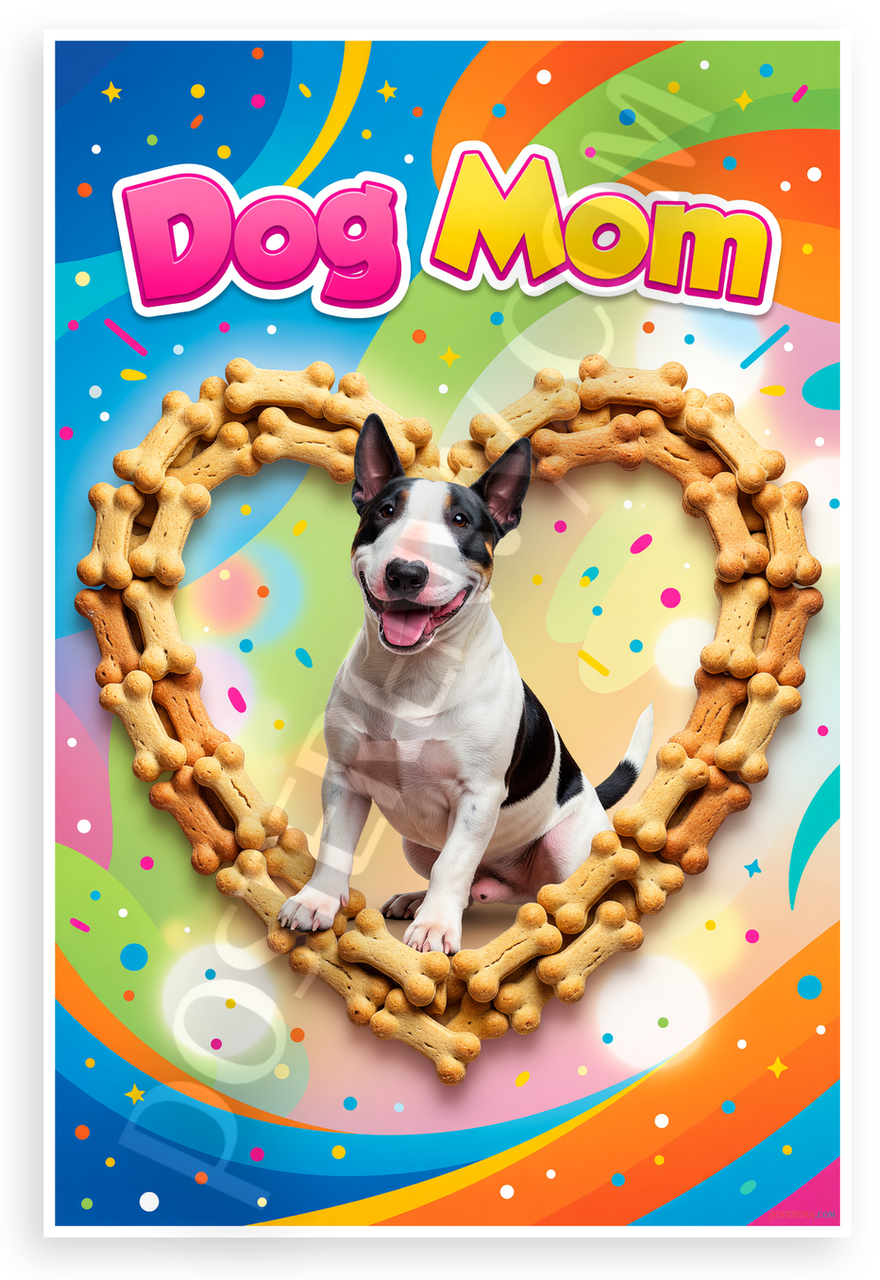 This 12x18 inch poster is printed on premium, durable paper. Proudly Made in the USA by PosterEnvy. The perfect size for any room. PosterEnvy is a family owned business, delivering top-notch posters around the world for over 20 years. Our posters are designed to last — they won't fade or pucker for years of enjoyment. Every poster features crisp, vivid artwork. We are a solar powered company. Celebrate dog motherhood with this vibrant design featuring a smiling Bull Terrier inside a heart frame of dog bone treats, bold 'Dog Mom' text, and colorful confetti bursts evoking joy and affection.