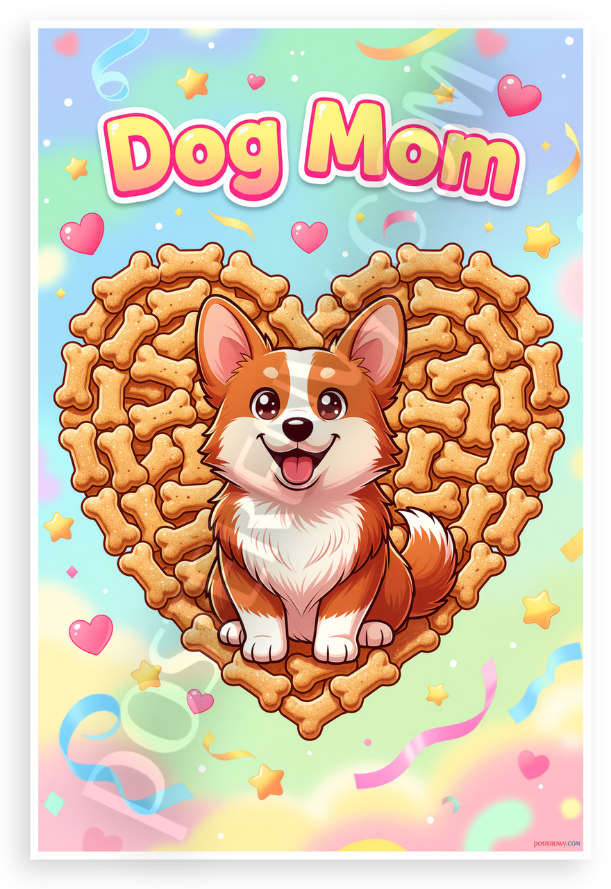 This 12x18 inch poster is printed on premium, durable paper. Proudly Made in the USA by PosterEnvy. The perfect size for any room. PosterEnvy is a family owned business, delivering top-notch posters around the world for over 20 years. Our posters are designed to last — they won't fade or pucker for years of enjoyment. Every poster features crisp, vivid artwork. We are a solar powered company. Celebrate dog lovers with this vibrant cartoon illustration of a smiling Cardigan Welsh Corgi puppy framed in a heart of tiny bone treats, topped with playful Dog Mom text amid colorful stars and ribbons.