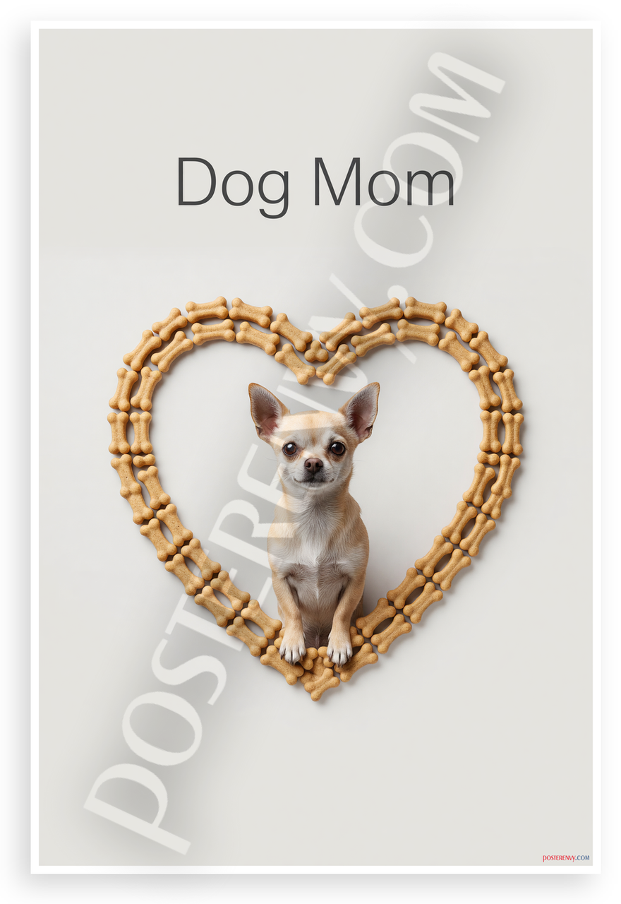 This 12x18 inch poster is printed on premium, durable paper. Proudly Made in the USA by PosterEnvy. The perfect size for any room. PosterEnvy is a family owned business, delivering top-notch posters around the world for over 20 years. Our posters are designed to last — they won't fade or pucker for years of enjoyment. Every poster features crisp, vivid artwork. We are a solar powered company. This minimalist poster features 'Dog Mom' text above a charming Chihuahua sitting inside a heart frame crafted from tiny bone-shaped treats, offering subtle elegance for dog lovers. Ideal for pet-themed decor with clean lines and warm tones.