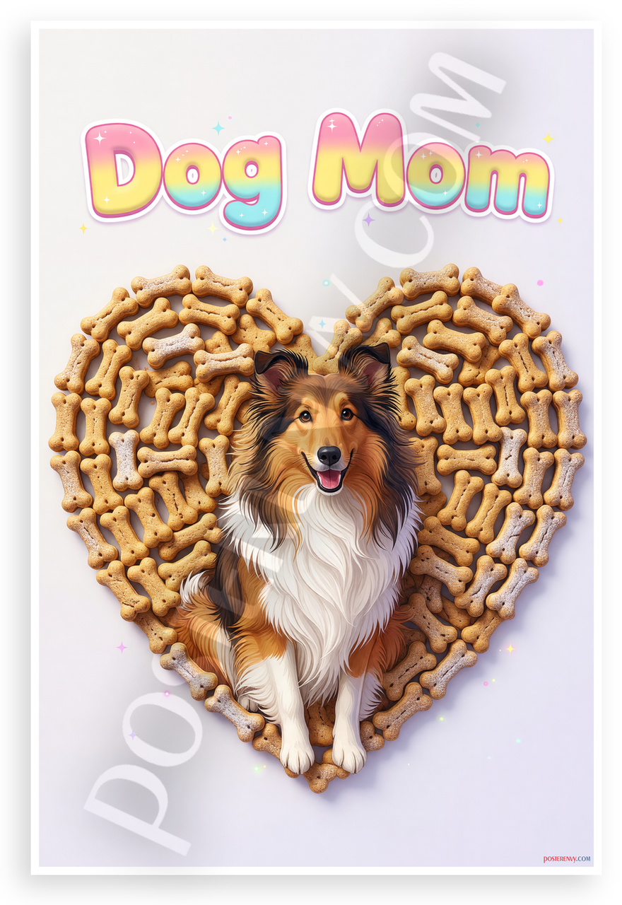 This 12x18 inch poster is printed on premium, durable paper. Proudly Made in the USA by PosterEnvy. The perfect size for any room. PosterEnvy is a family owned business, delivering top-notch posters around the world for over 20 years. Our posters are designed to last — they won't fade or pucker for years of enjoyment. Every poster features crisp, vivid artwork. We are a solar powered company. Celebrate dog lovers with this playful design featuring a cute Collie dog centered in a heart made of tiny bone-shaped treats, topped with vibrant 'Dog Mom' text in rainbow colors. Whimsical style evokes joy and affection for pet parents.
