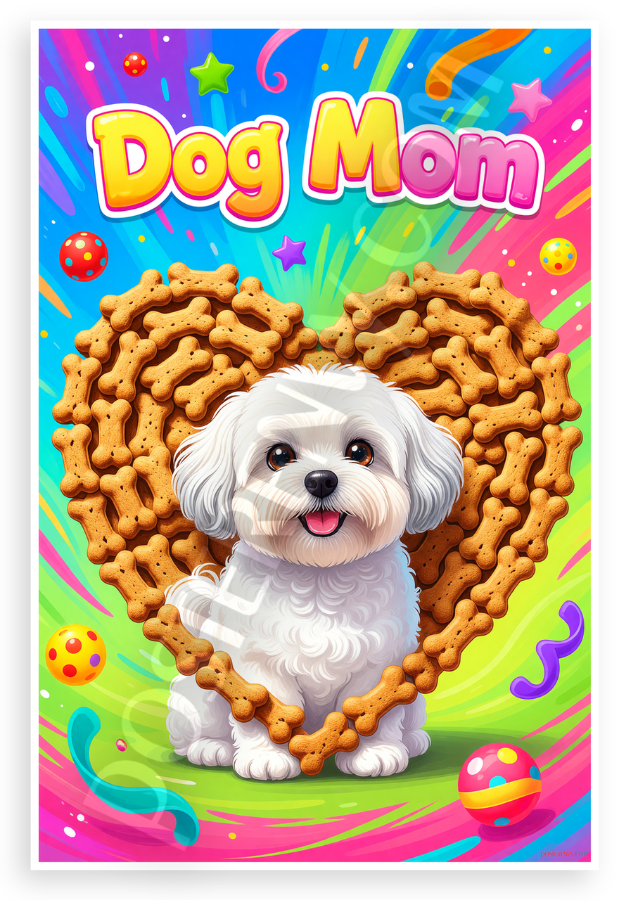 - Whimsical Dog Mom Design: Playful Coton de Tulear puppy inside heart-shaped dog bone treats frame, bold Dog Mom text, stars, balloons, toys on rainbow background. Ideal for kitchens, playrooms, pet areas