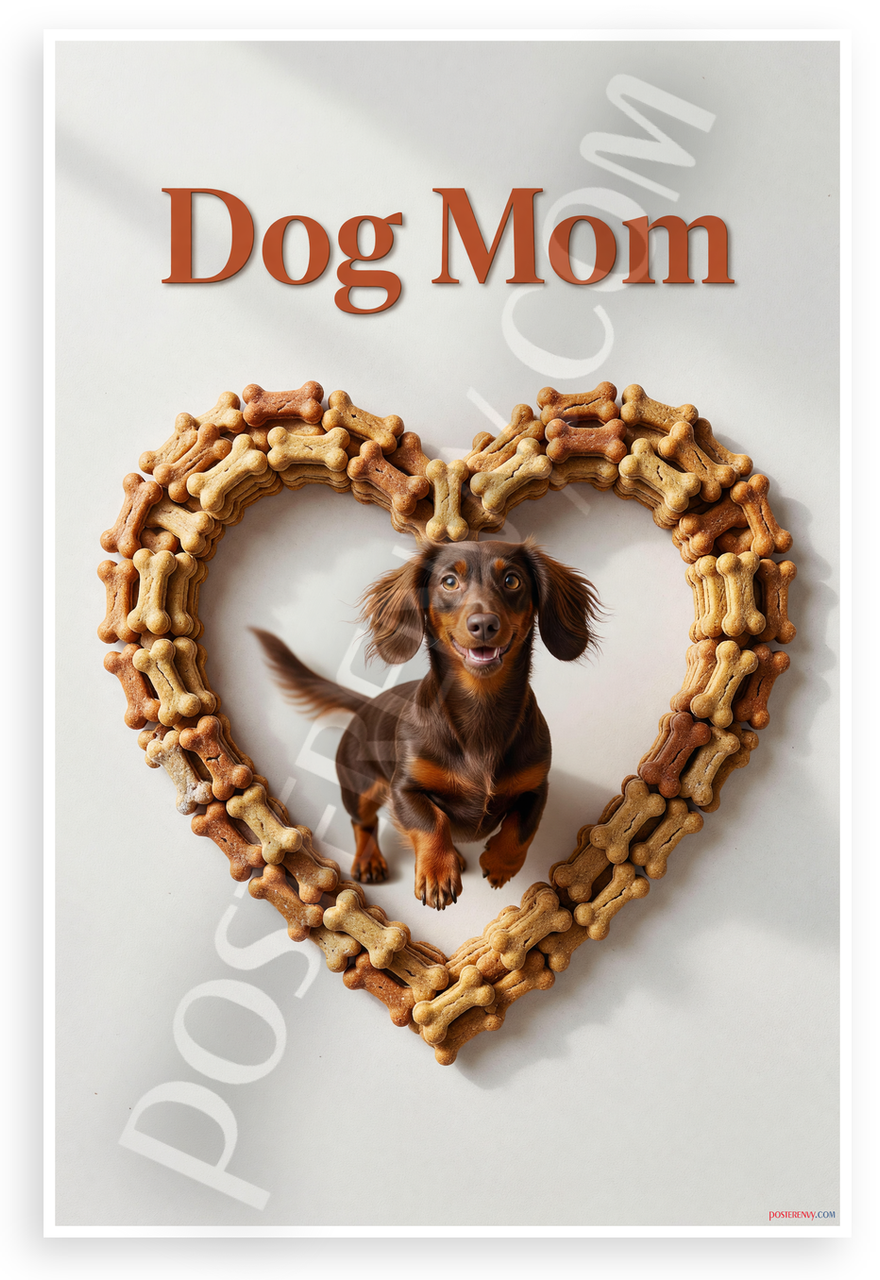 This 12x18 inch poster is printed on premium, durable paper. Proudly Made in the USA by PosterEnvy. The perfect size for any room. PosterEnvy is a family owned business, delivering top-notch posters around the world for over 20 years. Our posters are designed to last — they won't fade or pucker for years of enjoyment. Every poster features crisp, vivid artwork. We are a solar powered company. Celebrate pet love with this adorable Dachshund leaping joyfully inside a heart frame crafted from tiny dog bone treats, topped with empowering Dog Mom text in warm tones on a clean white background.