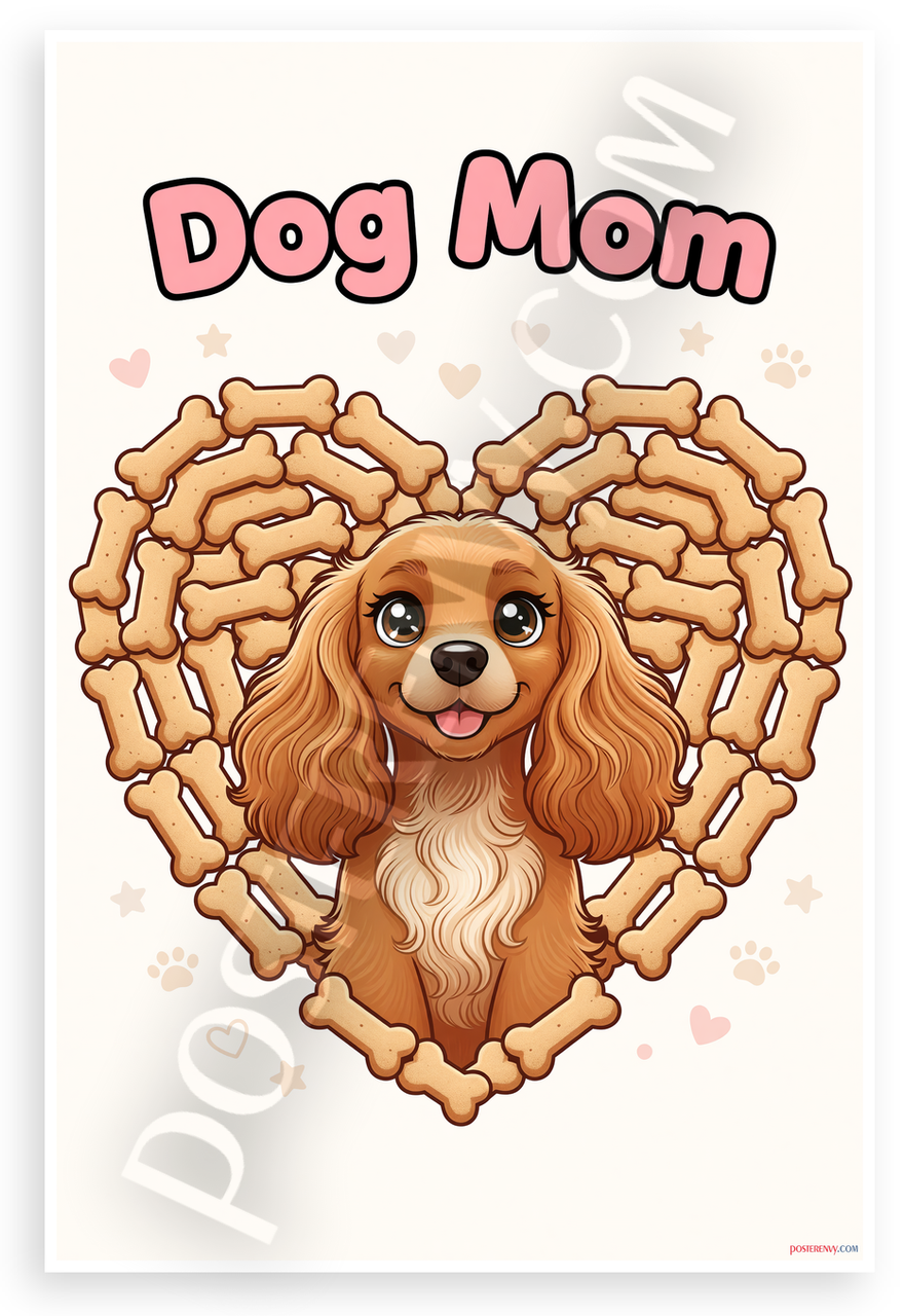This 12x18 inch poster is printed on premium, durable paper. Proudly Made in the USA by PosterEnvy. The perfect size for any room. PosterEnvy is a family owned business, delivering top-notch posters around the world for over 20 years. Our posters are designed to last — they won't fade or pucker for years of enjoyment. Every poster features crisp, vivid artwork. We are a solar powered company. This whimsical cartoon poster features a cute English Cocker Spaniel inside a heart made of dog bones with playful 'Dog Mom' text. Ideal for pet lovers and dog enthusiasts.