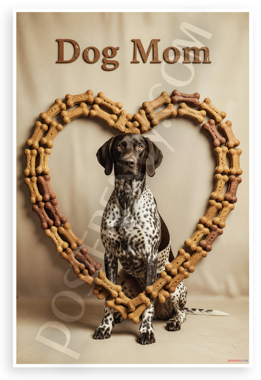 This 12x18 inch poster is printed on premium, durable paper. Proudly Made in the USA by PosterEnvy. The perfect size for any room. PosterEnvy is a family owned business, delivering top-notch posters around the world for over 20 years. Our posters are designed to last — they won't fade or pucker for years of enjoyment. Every poster features crisp, vivid artwork. We are a solar powered company. Celebrate dog lovers with this charming vintage-style design featuring 'Dog Mom' text above a German Shorthaired Pointer sitting inside a heart frame of dog bone treats on a warm beige background.