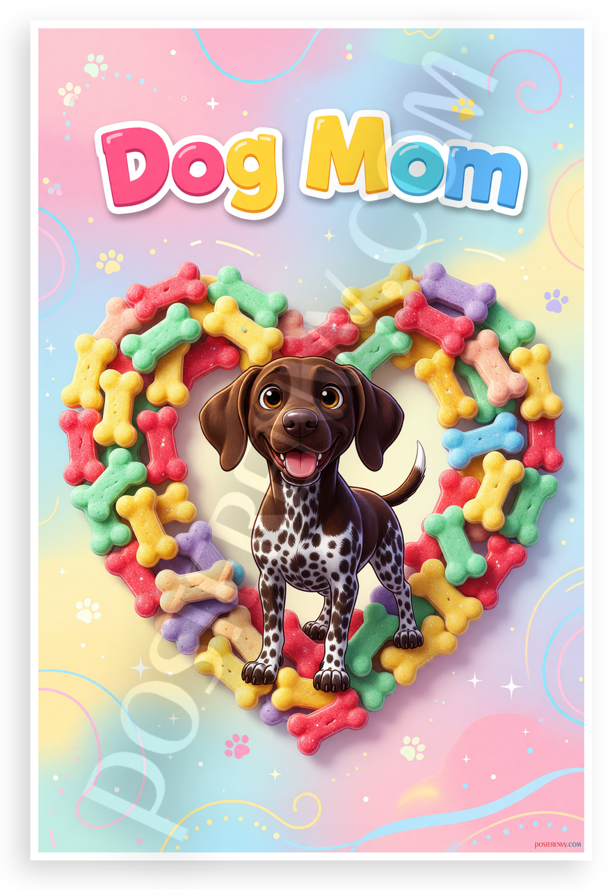 This 12x18 inch poster is printed on premium, durable paper. Proudly Made in the USA by PosterEnvy. The perfect size for any room. PosterEnvy is a family owned business, delivering top-notch posters around the world for over 20 years. Our posters are designed to last — they won't fade or pucker for years of enjoyment. Every poster features crisp, vivid artwork. We are a solar powered company. Celebrate dog lovers with this playful design featuring a cute German Shorthaired Pointer puppy inside a heart of colorful bone treats, topped with bold Dog Mom text in vibrant pink and yellow hues.