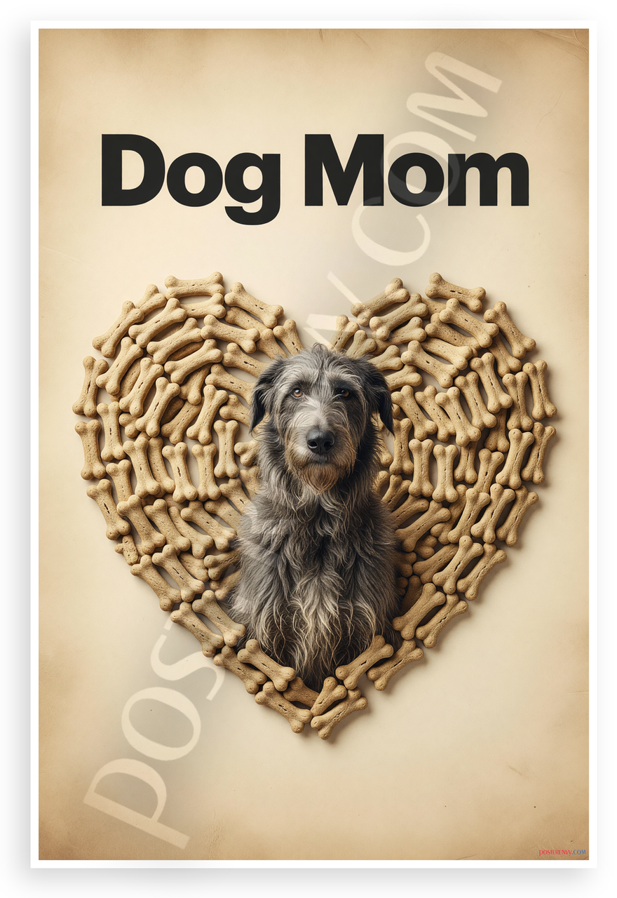 This 12x18 inch poster is printed on premium, durable paper. Proudly Made in the USA by PosterEnvy. The perfect size for any room. PosterEnvy is a family owned business, delivering top-notch posters around the world for over 20 years. Our posters are designed to last — they won't fade or pucker for years of enjoyment. Every poster features crisp, vivid artwork. We are a solar powered company. Celebrate dog lovers with this empowering vintage-style design featuring a majestic Irish Wolfhound centered in a heart of tiny bone treats under bold Dog Mom text on a parchment background.