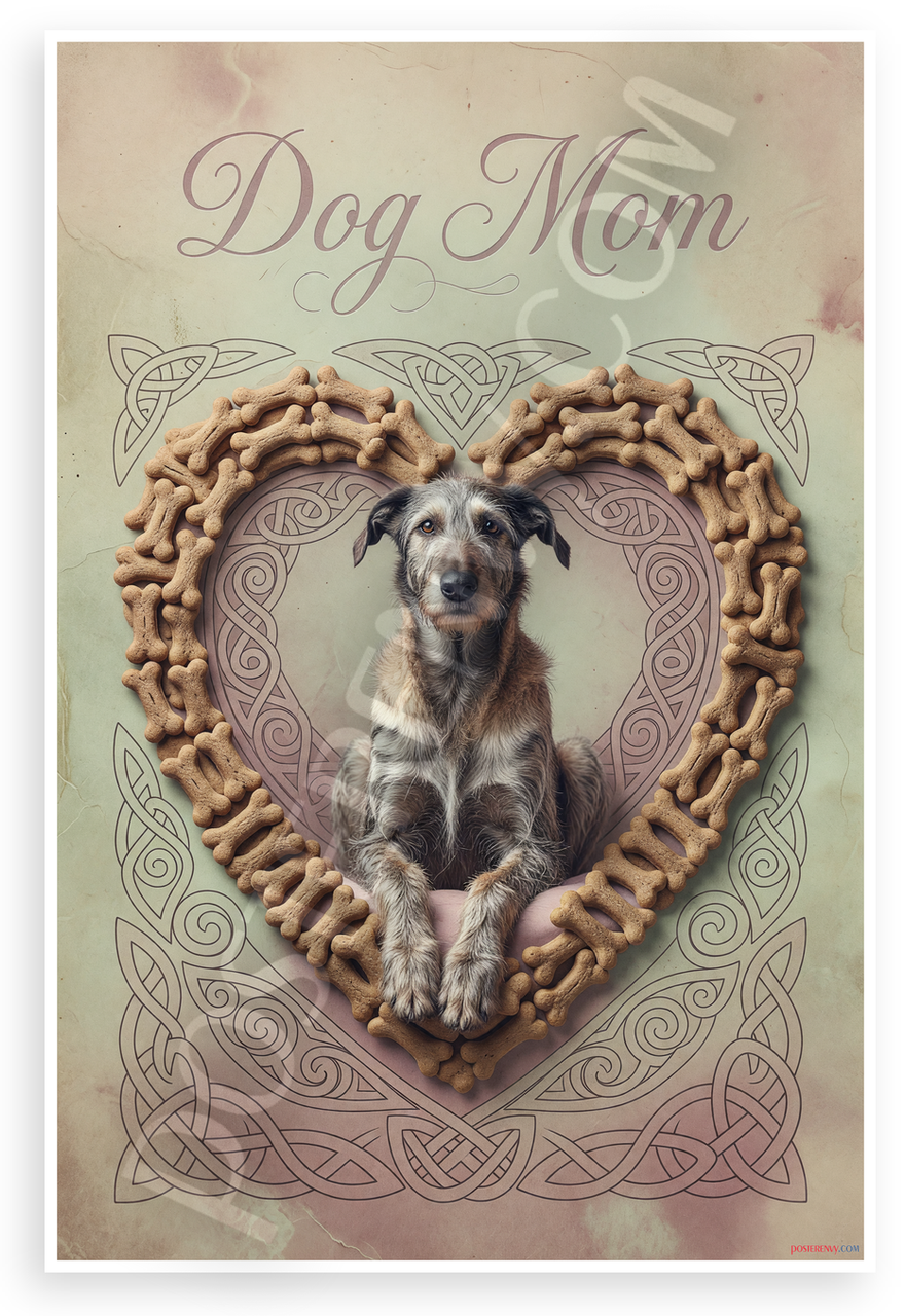 - Elegant Dog Mom Design: Vintage poster with Irish Wolfhound portrait in ornate dog bone heart frame, Celtic knots, and elegant script text evokes timeless serenity for kitchens, living rooms, or pet spaces