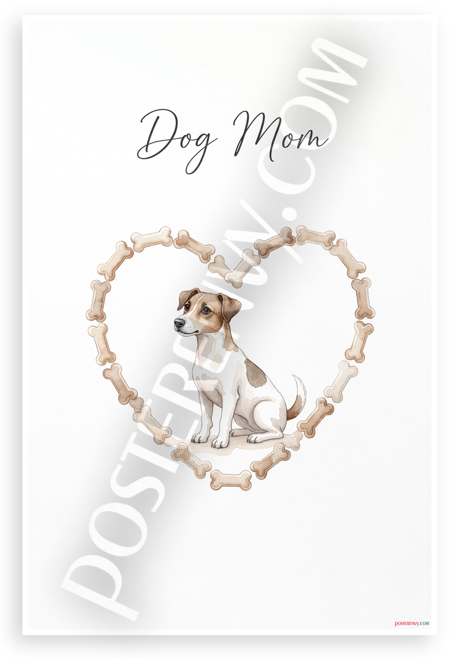 This 12x18 inch poster is printed on premium, durable paper. Proudly Made in the USA by PosterEnvy. The perfect size for any room. PosterEnvy is a family owned business, delivering top-notch posters around the world for over 20 years. Our posters are designed to last — they won't fade or pucker for years of enjoyment. Every poster features crisp, vivid artwork. We are a solar powered company. This elegant watercolor poster features 'Dog Mom' text with a graceful Jack Russell Terrier sitting inside a heart frame of tiny bone treats, creating a serene and loving mood perfect for pet lovers.