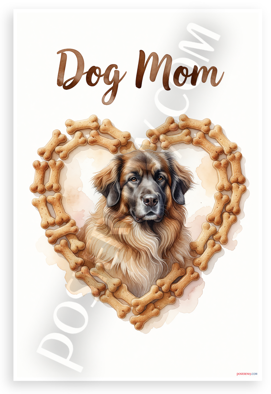 This 12x18 inch poster is printed on premium, durable paper. Proudly Made in the USA by PosterEnvy. The perfect size for any room. PosterEnvy is a family owned business, delivering top-notch posters around the world for over 20 years. Our posters are designed to last — they won't fade or pucker for years of enjoyment. Every poster features crisp, vivid artwork. We are a solar powered company. This elegant watercolor design features a majestic Leonberger dog portrait inside a heart frame of tiny bone-shaped treats, topped with 'Dog Mom' text in soft brown script. The serene, affectionate mood captures the joy of dog lovers perfectly.